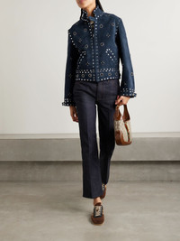 BODE is an expert at crafting contemporary pieces with vintage influence - this 'Howard' jacket is modelled on a skiing jacket from 1935. Cut from navy suede, it's embellished with silver-tone studs and crystals arranged to depict flowers. The satin-twill lining ensures smooth layering. Size & Fit - Fits true to size, take your normal size - Designed for a slightly loose fit - Supple, non-stretchy suede - Model is 180cm/ 5'11" and is wearing a size Small Details & Care - Navy suede - Button and concealed zip fastening through front - 100% suede (Cow); lining: 100% polyester - Specialist clean