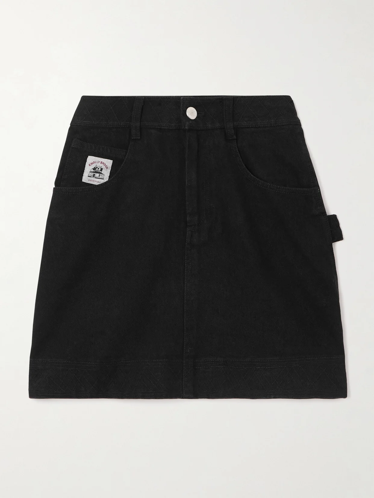 This skirt is based on a denim smock from Emily Adams Bode Aujla's personal collection, with the geometric embroidery neatly replicated along the waistband and mini hem. The 'Knolly Brook' label tag is inspired by classic workwear labels, furthering its vintage feel.