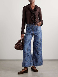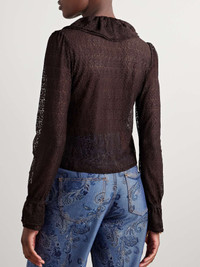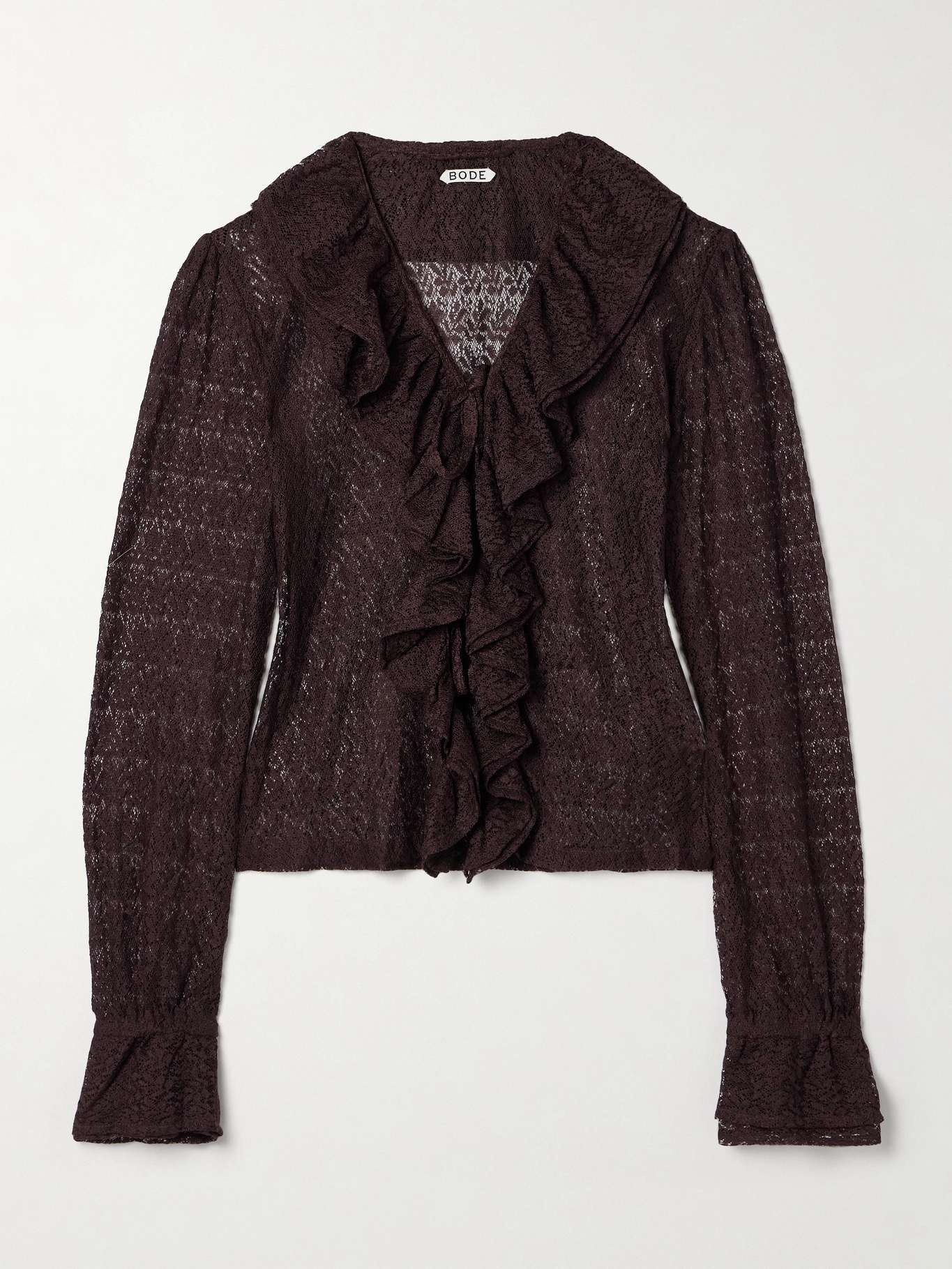 EDITORS'NOTES BODE's blouse is inspired by a pair of lace tap shorts from the 1930s. Cut from a brown version of the delicate fabric, it's traced with cascading ruffles along the front and has flared cuffs. SIZE & FIT Model measurements: - Fits true to size, take your normal size - Designed for a slightly loose fit - Lightweight, sheer, non-stretchy fabric - Model is 175cm/ 5'9" and is wearing a size XSmall - Bust: 79cm/ 31" - Waist: 61cm/ 24" - Hip: 89cm/ 35" DETAILS & CARE - Dark-brown lace - Tie fastenings through front - 100% nylon - Dry clean