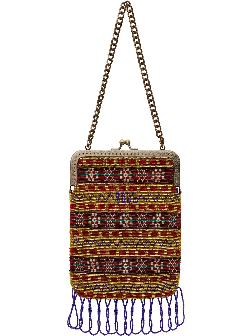 Beaded canvas top handle bag in multicolor. · Graphic pattern throughout · Curb chain carry handle · Logo at face · Beaded fringe trim at base · Kiss-lock closure · Floral pattern embroidered at interior · Satin lining · H8" x W6" This item is part of a limited run of 23. Supplier color: Multi 50% glass, 50% polyester. Made in India 252169F046001