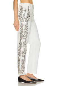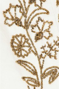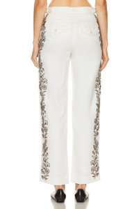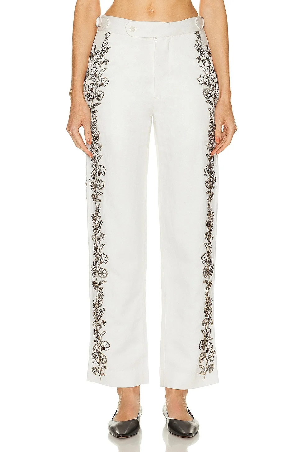 Details - 52% linen, 48% cotton - Made in India - Dry clean only - Zip fly with hook and bar closure - Side slant and back flap pockets with button closure - Beaded floral design at side - Adjustable hips straps - Twill fabric - Our Style No. BOFE-WP5 - Manufacturer Style No. MRF23BT001