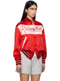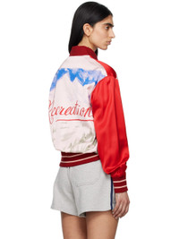 Viscose- and modal-blend satin jacket. · Rib-knit stand collar, hem, and cuffs · Button closure · Hand-printed text at chest and back · Welt pockets · Stripes at hem and cuffs · Hand-printed graphic at back · Full cotton poplin lining This item is part of a limited run of 68. Supplier color: Multi Body: 56% viscose, 44% modal. Lining: 100% cotton. Made in India 252169F063001