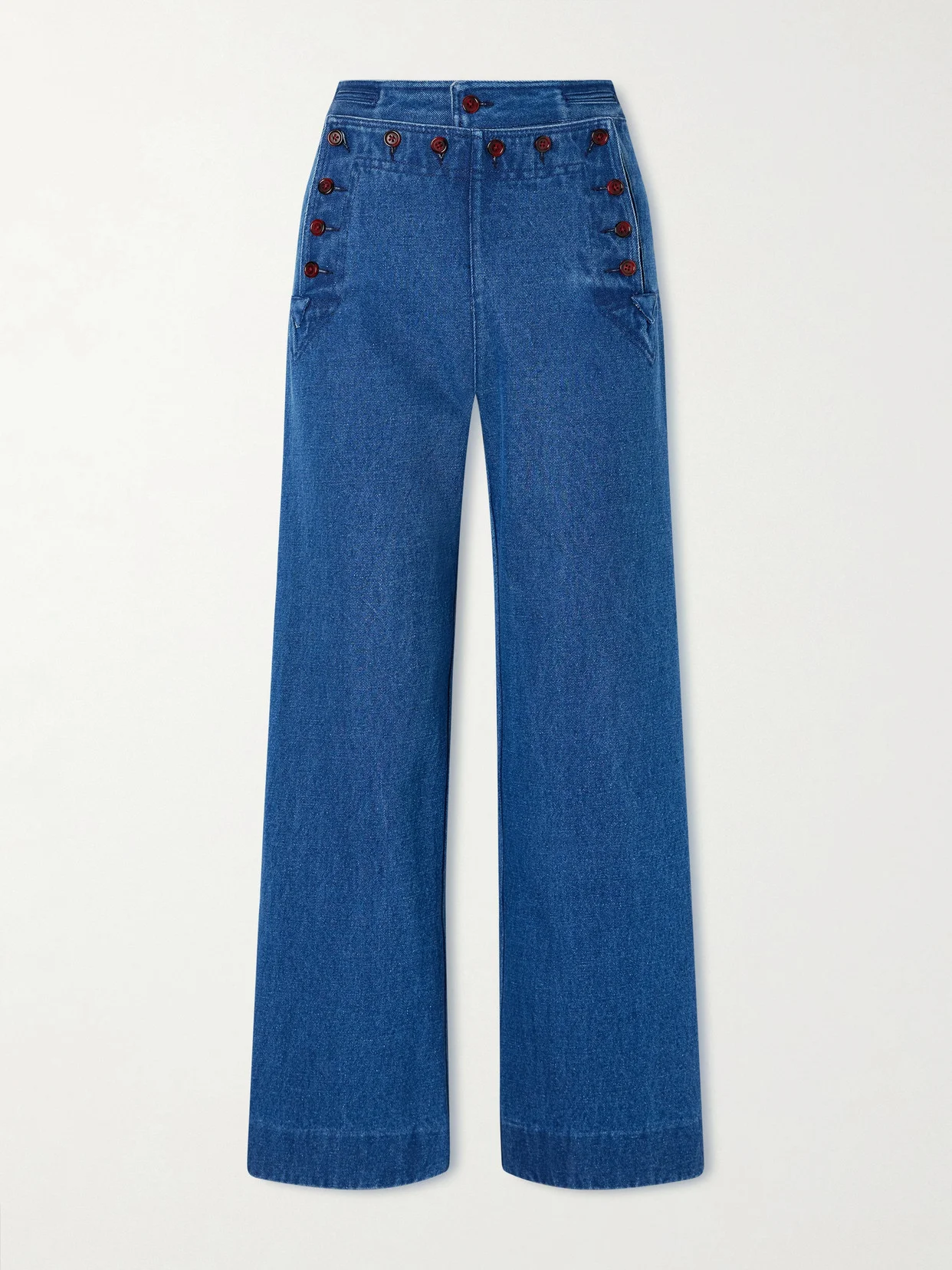 BODE's jeans reference traditional sailor uniforms - they button in just the same way. Made from denim, they have a wide-leg shape and a high-rise waist. Small to size. See Size & Fit notes.