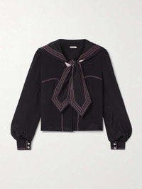 BODE's 'Seafarer' shirt is a replica of a vintage sailor's top from the 1920s. Made from airy silk, it's detailed with maritime-inspired stripes along the collar, neckties and cuffs. Size & Fit - Fits true to size, take your normal size - Designed for a loose fit - Lightweight, non-stretchy fabric - Model is 175cm/ 5'9" and is wearing a size Small Model measurements: - Bust: 79cm/ 31” - Waist: 61cm/ 24” - Hip: 88cm/ 34.5” Details & Care - Black silk - Concealed button fastenings through front - 100% silk - Dry clean
