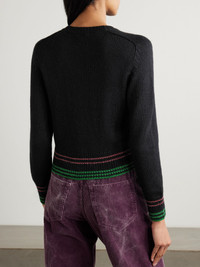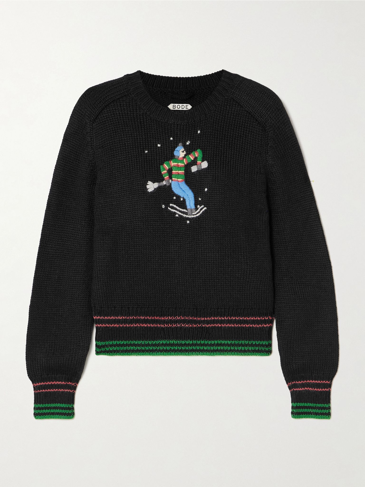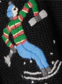 Whether you’re enjoying some apres-ski or a festive get-together, BODE’s sweater will ensure you’re doing it appropriately. Made from tactile alpaca, it has contrasting stripes along the ribbed hem and is embroidered with a skier surrounded by a dusting of snow. Wear yours with ski pants or flared denim. Size & Fit - Fits true to size, take your normal size - Designed for a slim fit - Mid-weight knit - Model is 175cm/ 5'9" and is wearing a size Small Model measurements: - Bust: 81cm/ 32" - Waist: 64cm/ 25" - Hip: 89cm/ 35" Details & Care - Multicolored alpaca - Slips on - 100% alpaca - Dry clean