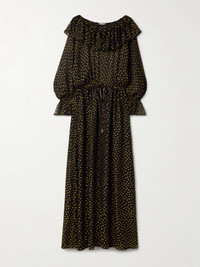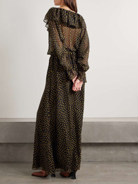 EDITORS'NOTES BODE often pulls inspiration from the past - this 'Stadium' gown is modeled after a '60s French blouse. It's made from sheer silk-blend chiffon woven with golden fil coupe polka-dots and has a ruffled neckline. Underpin it with an opaque slip, pulling the drawstrings tight to cinch the waist. SIZE & FIT Model measurements: - Fits true to size, take your normal size - Designed for a loose fit, use the adjustable drawstring to cinch in at the waist - Lightweight, non-stretchy fabric - Model is 180cm/ 5’11” and is wearing a size Small - Bust: 81cm/ 32” - Waist: 62cm/ 24.5” - Hip: 88cm/ 34.5” DETAILS & CARE - Black and gold fil coupe silk-blend chiffon - Slips on - 90% silk, 10% polyester - Dry clean