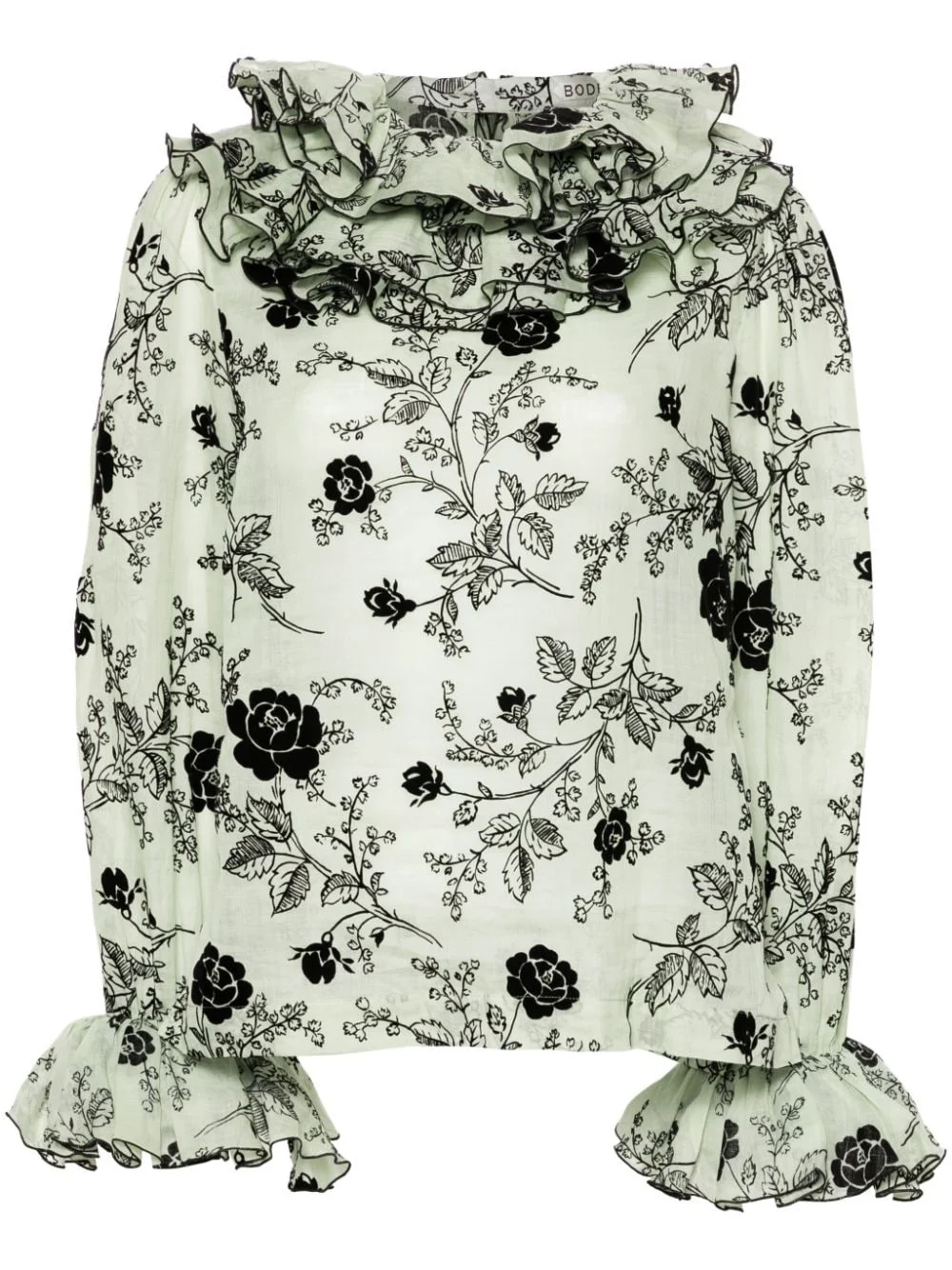 Sweetunia flocked-floral blouse Highlights - Mint green/black - Textured finish - All-over flocked floral pattern - Round neck - Ruffled detailing - Long sleeves - Buttoned cuffs - Short side slits - Keyhole detail to the rear - Straight hem - Rear button fastening Imported Composition Rayon 100% SIZE & FIT Model measurements Height 5 ft 11 in(1.8 m) Bust/Chest 32.67 in(83 cm) Hips 36.22 in(92 cm) Waist 24.4 in(62 cm) FittingInformation Designed for a relaxed fit, this piece allows for comfort and movement when worn Made from a lightweight non-stretch fabric This piece fits true to size – take your usual size