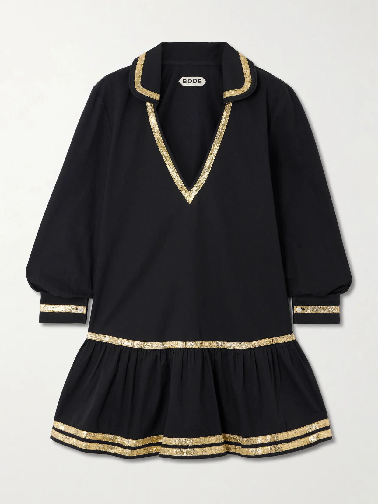 Get in the holiday spirit with BODE's mini dress - it's traced with gold trims to resemble sparkling tinsel. Made from cotton-poplin, it has a floaty shape and a deep V-neckline that calls for a lariat chain.
