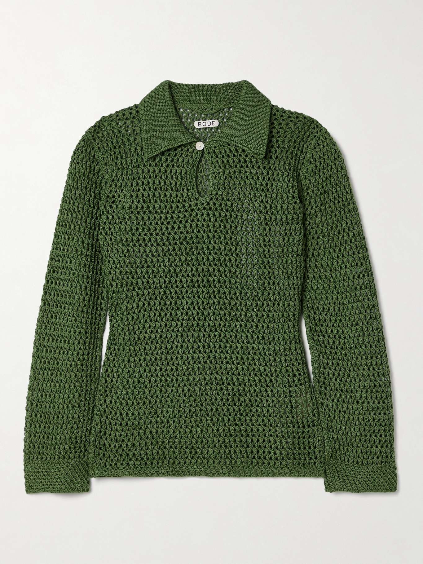 EDITORS'NOTES Inspired by a style from the '40s, BODE's 'Willows' shirt is crocheted from cotton with a breezy, open construction and has a polo collar with a small keyhole accent. Underpin yours with a bralette or camisole for added coverage. SIZE & FIT Model measurements: - Fits true to size, however those who are between sizes should take the larger size - Those with a curvy figure may wish to take the next size up - Cut for a slim fit - Cropped sleeves - Lightweight, open knit - Model is 183cm/ 6'0" and is wearing a size Small - Bust: 79cm/ 31" - Waist: 61cm/ 24" - Hip: 85cm/ 35.5" DETAILS & CARE - Green crocheted cotton - Button-fastening keyhole at front - 100% cotton - Dry clean