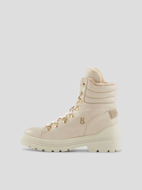 Thanks to the pure lambskin interior, the Arosa mid boots in grained leather are an impressive highlight in the colder seasons. The style is lent an alpine flair by the eyelet lacing and a gold-look click fastener, rounded off by a classic ‘B’ zipper. The rubber tread sole takes care of walking comfort. Order no. 234-6434-Z152-AAD Details - Boots made from grained leather with lambskin inlay - ‘B’ logo zipper on the side for fastening - Five eyelet lacing and logo embossed click closure - Mid-height upper and rounded toe cap - Rear pull loop and tab details on the heel - Interior finish in lambskin - Removable insole - Bootleg height: 12 cm - Bootleg width: 10 cm - Rubber profile sole - Plateau height (front): 2 cm - Heel height: 3 cm - Supplied with branded shoe bag - Made in Italy Material & care Material Shell: Leather Lining: Lamb Insole: Lamb Sole: Rubber Material description Grained calfskin with shearling details, soft lambskin inner and comfortable rubber tread sole Material hints Contains non-textile parts of animal origin
