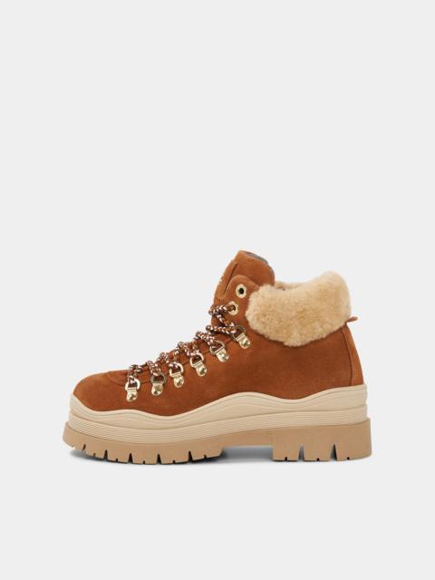 The Calgary lace-up boots are made from suede with a warming inlay made from pure lambskin - complemented by the rubberized outsole with fold-out spikes for more grip. The quilted shaft and signature accents create a modern look. The classic lacing and side zipper round off the items harmoniously. Style number 254-6434-Z033-017 Details - Suede boots with lambskin details - Closed with classic lacing B-zipper on the side - Rounded toe cap - Stitched upper Shoe tongue with B-Signe BOGNER embossed metal eyelets Rubber section with embossed logo on the heel Tonal stitching - Inlay and removable lambskin insole - Bootleg height: 16 cm - Bootleg width: 10 cm - TR outsole with OCsystem® spikes to fold out - Plateau height (front): 2,5 cm - Heel height: 2,5 cm - Logo shoe bag included - Made in Italy Material & care Material Shell 1 1. Layer: % Leather Shell 2 1. Layer: % Lamb Lining 1. Layer: % Lamb Insole 1. Layer: % Lamb Sole 1. Layer: % Rubber Material description Made from suede with lambskin details Lining and insole made from pure lambskin TR-Rubber outsole with OCsystem® Tipper