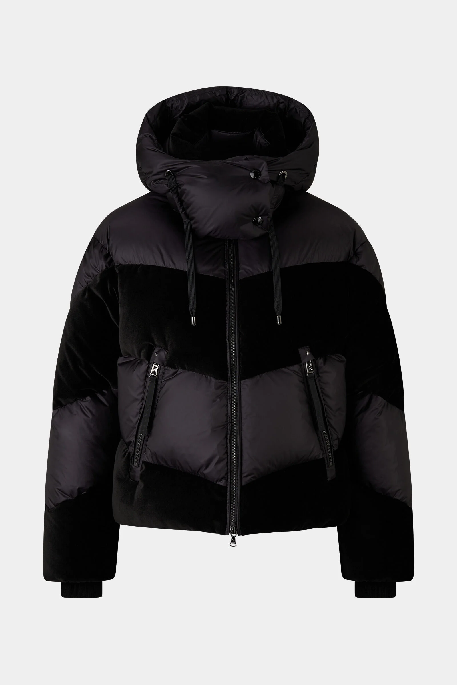 The Cathy down jacket boasts a quilted design with velvet sections - complemented by the detachable hood and stand-up collar. Ribbed cuffs and an adjustable hem ensure comfort. The padding made from pure duck down provides optimum thermal insulation. Style number 254-3600-9865-026 Details - Quilted down jacket in a lightweight loose fit With velvet sections - Padded stand-up collar - Detachable hood with drawstring and press stud placket - Long sleeves - Elasticated cuffs with inside ribbed cuffs - Closed with an underlaid two-way zip - Two side zip pockets - BOGNER-embossed eyelets and fixable grosgrain ribbon with B logo embossed metal ends on the hood Logo 'B' logo patch on the sleeve B pendant on the zippers - With water-repellent finish - Warming padding made from pure duck down - Hem with drawstring, logo stoppers and eyelets, inside with logo grosgrain ribbon - Back length: 59 cm Material & care Material Shell 1 1. Layer: 100% Polyester Shell 2 1. Layer: 55% Polyamide, 45% Polyamide (Recycled) Lining 1 1. Layer: 100% Polyester (Recycled) Filling 1 1. Layer: 100% Duck down Material description Water-repellent tech quality with velvet sections and tech lining Warming padding made from pure duck down Sterilization number UT 70027 (CN) Material hints Contains non-textile parts of animal origin Sterilisation number: This article is a product with a filling of animal origin. It has been properly sterilised by the manufacturer so that no harmful microorganisms can be transported in the filling. With respect to our environment, this product was produced without the intentional addition of per- and polyfluoroalkyl substances (PFAS). It offers water-repellent properties that increasingly avoid the use of harmful, persistent chemicals. To maintain the high functionality and durability of the garment, we recommend diligent product care in accordance with the instructions on the care label. Reactivation of the existing impregnation by washing with subsequent moderate heat treatment (dryer - impregnation programme), see care label or use a professional cleaning service. After repeated washing or cleaning re-impregnation is recommended. Care do not wash do not bleach do not tumble dry do not iron gentle dry-cleaning no wet-cleaning