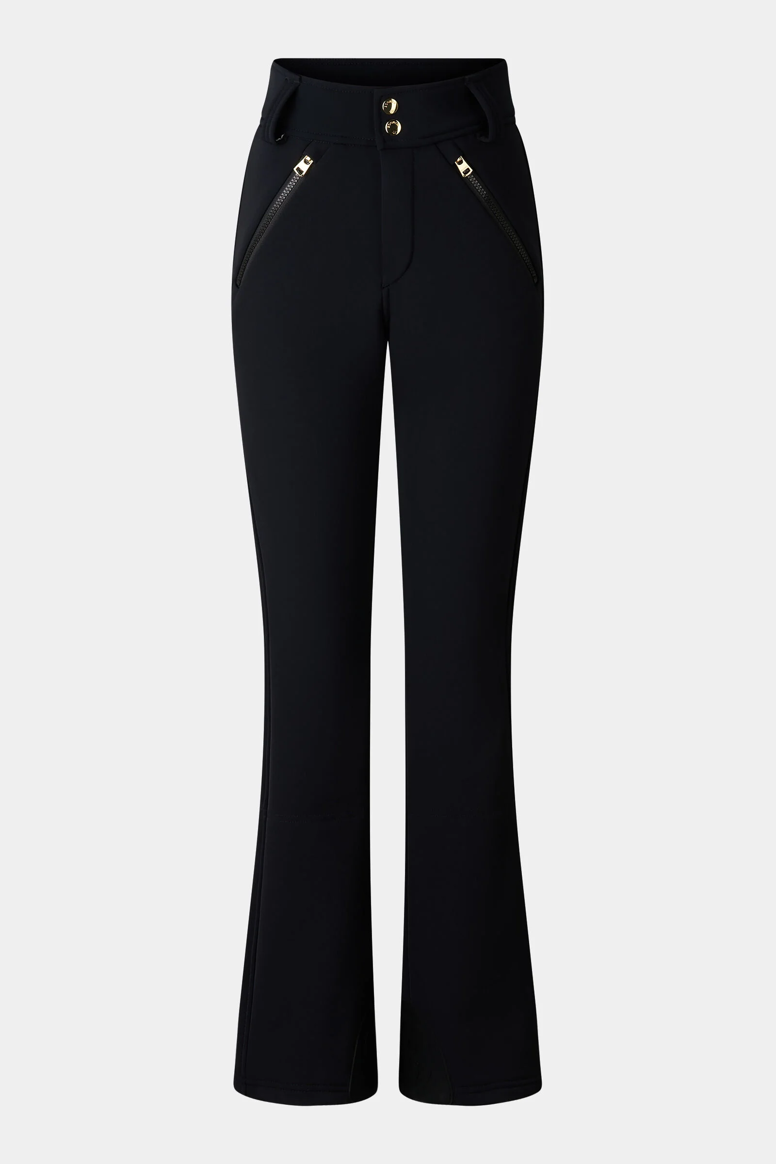 Three-layer Schoeller softshell in 4-way stretch fabric with a water-repellent membrane makes the Hazel ski trousers a top performer for winter sports. Modern elements include zipped pockets, B-rubber patches on the hems and gold-look embossed hardware. Classic cuffs with a snow guard round off this functional piece. Style number 254-1168-9562-026