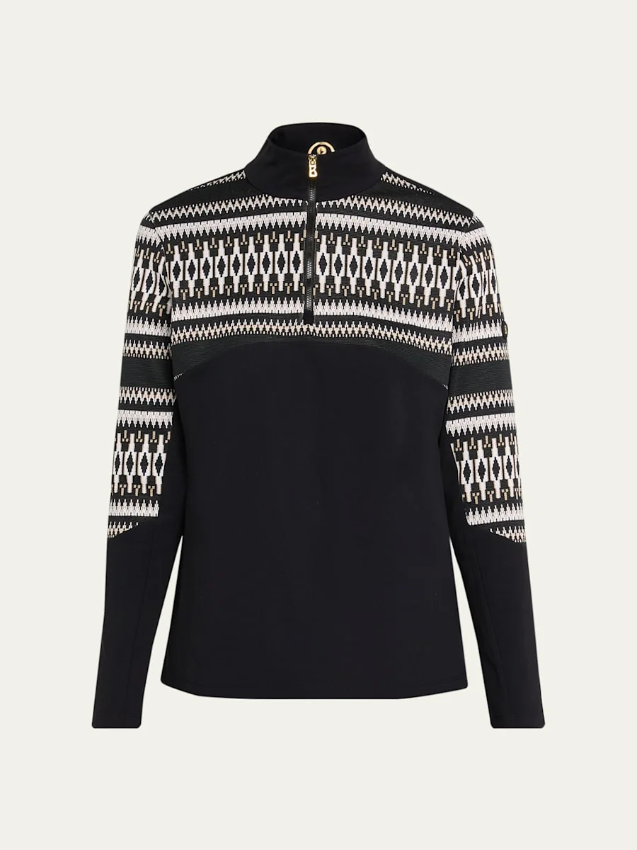 Adorned with a jacquard pattern, the "Jelissa" first layer by Bogner from the Sport collection is crafted from a stretch fabric that ensures comfort on and off the slopes. Stand collar; half zipfront with logo pull Long sleeves Classic fit Hem sits at the hip Pullover style Nylon/polyamide/elastane Machine wash cold Imported