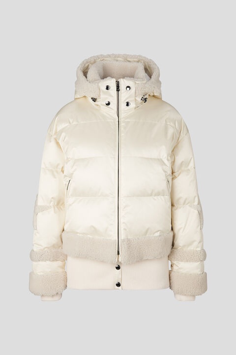 Made of functional satin in a modern look with attention-getting shearling details, the Mia ski jacket is hard to beat thanks to its high-performance fashion twist. Stylish appliquéd snow stars add striking accents. Down padding ensures a comfortable wearing experience, while the snow guard with a wide ribbing border offers protection from the cold. A variably adjustable hood adds a masterful finishing touch to this alpine look. Order no. 234-3160-7452-133 Details - Regular fit ski jacket - Design made of technical satin with lambskin and padding - Stand-up collar with concealed hood attachment and logo snap buttons - Detachable hood with adjustable drawstring - Sleeves with ribbed cuffs attached inside - Rubber patch on the left sleeve - Fastened with a ‘B’ logo zipper - Two side zipper pockets - One closable inside pocket - Lambskin star details on the hood, sleeves and back - Pure down padding - Functional snow guard inside with wide ribbing waistband and logo snap buttons - Hem finished with internally-adjustable elasticated drawstring - Back length: 64 cm Material & care Material Shell: 100% Polyamide 2. Layer: 100% Polyurethane Shell 2: 100% Lamb Shell 3: 85% Cotton, 14% Polyamide, 1% Elastane Lining: 100% Polyester Lining 2: 100% Polyester Padding: 90% Goose down, 10% Goose feathers Material description Functional satin made of 100% recycled technical fibers with a polyurethane second layer, lambskin details and ribbed knit in a technical cotton blend Lining 1 with 64% recycled fibers, Lining 2 made of 100% recycled fibers Goose down and goose feather padding Sterilization number: PA 9808 (IT) Material hints Contains non-textile parts of animal origin Sterilisation number: This article is a product with a filling of animal origin. It has been properly sterilised by the manufacturer so that no harmful microorganisms can be transported in the filling. Care do not wash do not bleach do not tumble dry do not iron do not dry-clean no wet-cleaning Do not wash. Treat before wearing