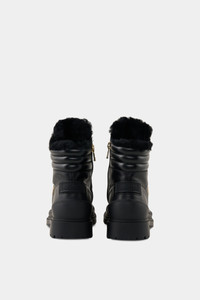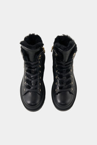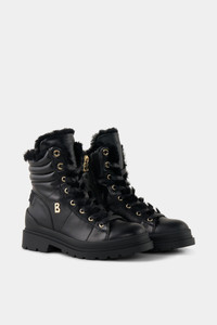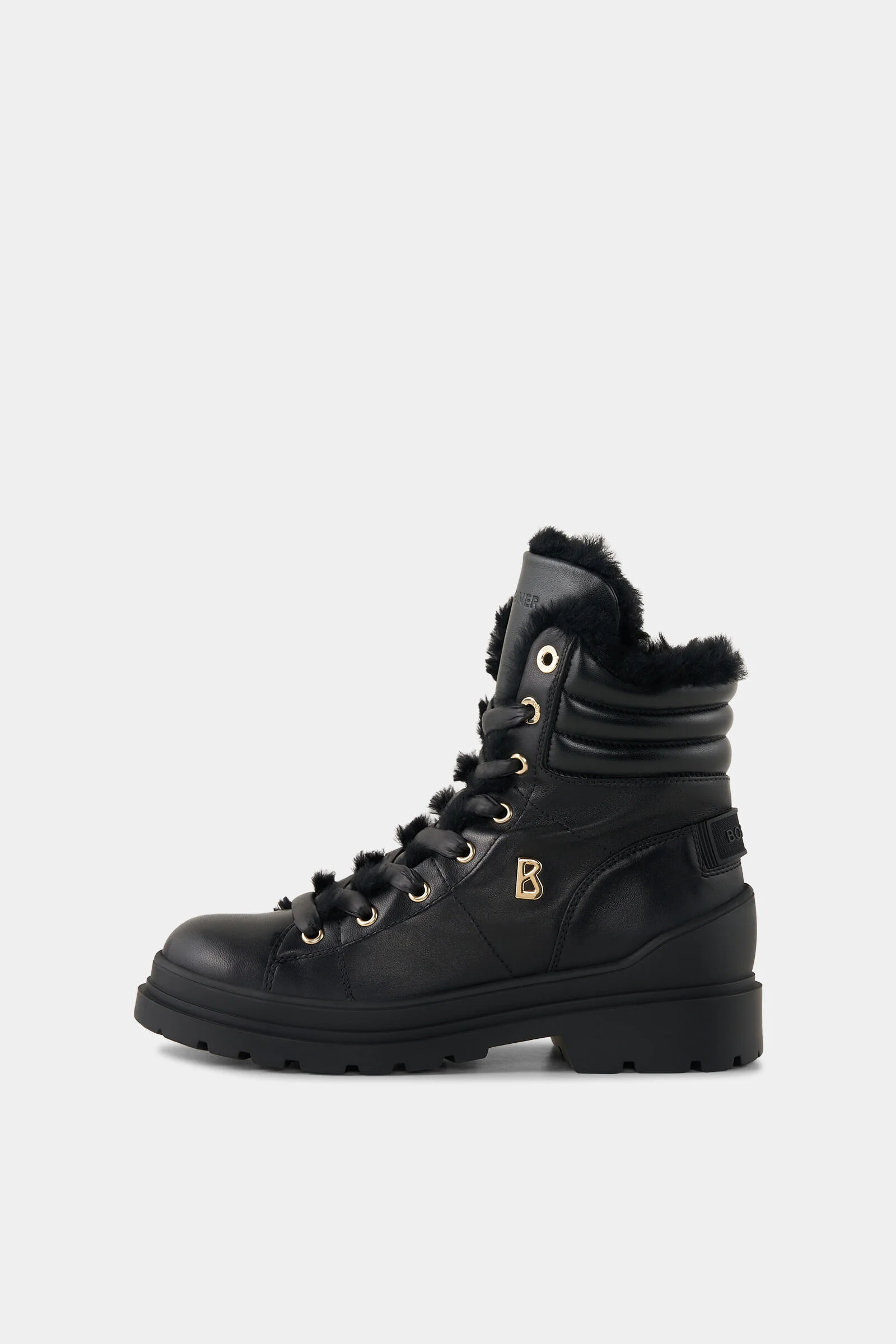 The gold-look hardware and elastic eyelet lacing give the St.Moritz mid boots made from nappa leather a stylish upgrade, complemented by quilted details and a luxurious lambskin interior. Integrated spikes provide alpine flair and grip on frozen ground. Style number 254-6434-Z166-001 Details - Nappa leather boots with lambskin inlay - Closed with side B-logo zipper Eight eyelet lacing with elastic drawstrings - Mid-high shaft and rounded toe cap - B-signe applied to the side and embossed logo on the tongue Rubber strap on the heel - Lambskin interior Removable insole - Bootleg height: 10 cm - Bootleg width: 8 cm - Rubberized tread sole Fold-out spikes for a secure grip in the snow - Plateau height (front): 2 cm - Heel height: 3 cm - Logo shoe bag included Made in Italy Material & care Material Shell 1 1. Layer: % Calfskin Lining 1. Layer: % Lamb Insole 1. Layer: % Lamb Sole 1. Layer: % Rubber Material description Smooth nappa leather and extra-soft lambskin inlay Rubber tread sole with patented spike system: OC SYSTEM®TIPPER anti-slip system for stability and grip on frozen surfaces