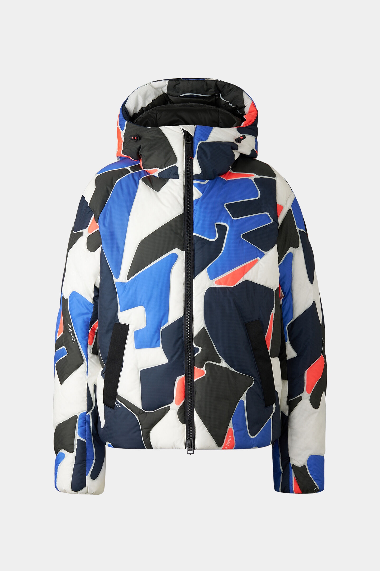 The Ronnie ski jacket features padding made from recycled technical fibers for optimum thermal insulation, further enhanced by its breathable, waterproof, and water-repellent properties. The adjustable hood and internal snow skirt make functional additions to the piece, while the printed design with signature lettering gives it a cool finish. Style number 244-3475-8809-354 Details - Hand-quilted ski jacket in regular fit - In graphic print design with FIRE+ICE lettering - Fixed hood with inserted logo corded ribbon trim, drawstring tunnel and stoppers - Slightly overcut shoulders and sleeves with elasticated cuffs, with textile logo patch and invisible in-seam ski pass pocket on the left - Fastened with an underlaid two-way zipper with ‘B’ logo pendants and zipper garage - Two concealed side zipper pockets - With water-repellent finish - Water column: 3.000 mm - Breathability: 3.000 g/m²/24h - Warm Thermore® Ecodown® padding - Snow guard with snap button placket - Hem finished with internal drawstring and stoppers - Back length: 63 cm Material & care Material Shell: 100% Polyester 2. Layer: 100% Polyurethane Lining: 100% Polyamide Padding: 100% Polyester Material description Breathable, double-layered ripstop fabric made of technical fibers with a water-repellent finish and a water column of 3,000 mm Flowing lining in nylon Padded with 100% recycled fibers – Thermore® Ecodown® – extra warm and lightweight with high loft (fluffiness), no animal materials, breathable and easy-care Care mild fine wash do not bleach mild drying process handwarm ironing do not dry-clean wet-cleaning Wash separately at 30°C, use only down or mild liquid detergent