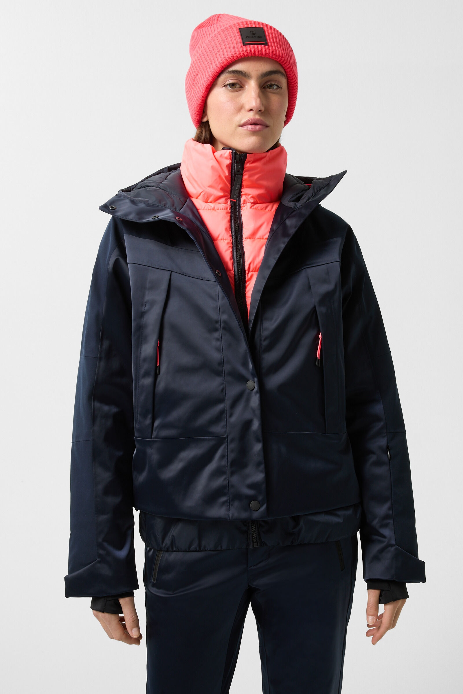 In a functional combination of styles comprising technical satin, quilted and padded nylon fabric and mechanical stretch, the Tinka ski jacket is an impressive alpine key piece. Its polyurethane finish and thermo-sealed seams upgrade its high-performance properties. The fashionably longer nylon snow skirt and the adjustable, elasticated drawstrings on the hood and hem complete the design. Style number 244-3451-8692-468 Details - Ski jacket in loose fit - Made from technical satin with quilted nylon fabric and mechanical stretch - High hooded collar and stand-up collar inside made from quilted nylon - Fixed hood with adjustable drawstring on the front and rubber stoppers - Long raglan sleeves, with rubber patch on the left - Sleeves finished with adjustable velcro tabs and thumb loops attached inside - Fastens with logo-embossed snap buttons and inserted quilted front with zipper fastening - Two concealed zippered pockets - Invisible in-seam ski pass pocket on the left sleeve - One closable inside pocket - Zippered ventilation vents under the sleeves - Back in blouson style with overcut section - Contrasting details - Water column: 10.000 mm - Breathability: 10.000 g/m²/24h - Technical padding - Fully bonded seams - Stretchy snow skirt in nylon with rubberized hem in longer design - Hem finished with internally-adjustable elasticated drawstring - Back length: 65 cm Material & care Material Shell: 100% Polyester 2. Layer: 100% Polyurethane Shell 2: 100% Polyester 2. Layer: 100% Polyester Lining: 100% Polyamide Lining 2: 100% Polyamide Lining 3: 100% Polyester Padding: 100% Polyester Filling 2: 100% Polyester Material description Technical satin and mechanical two-way stretch fabric in breathable, wind- and water-resistant construction and with a durably water-repellent finish Second layer made of polyurethane Outer fabric 2 made from 100% recycled polyester Technical lining fabric, second lining made from up to 100% fibers of recycled origin Technical padding with Thermore® Ecodown made from 100% recycled fibers Second padding made from pure technical fibers Fully bonded seams Care mild fine wash do not bleach mild drying process handwarm ironing do not dry-clean wet-cleaning Only use liquid mild detergent. Do not use fabric softener