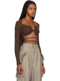 Brushed stretch cotton and polyester-blend jersey T-shirt. · Bungee-style drawstring at square neck and hem · Cutout at front · Wraparound self-tie straps at back Supplier color: Dark brown 48% cotton, 48% polyester, 4% spandex. Made in South Korea 222253F110002