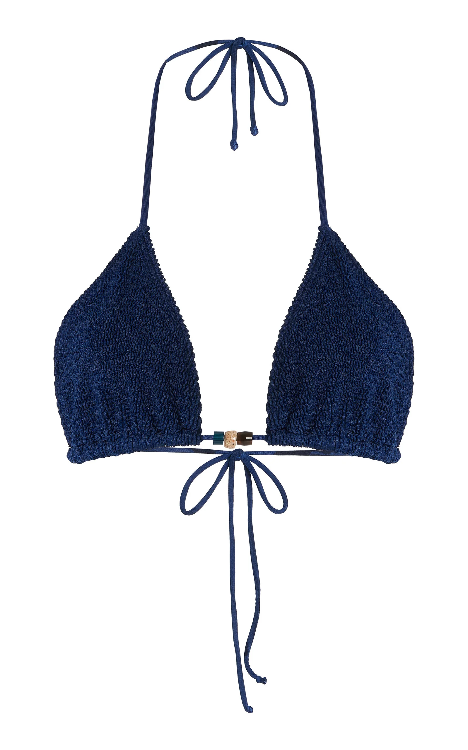 Bond-Eye is the embodiment of the iconic Australian summer spirit. Designed and handmade in Bondi, the label crafts considered and flattering swimwear, with equally as coveted resort wear. Made in Australia from The Authentic Crinkle™, the beaded 'Ingrid' is a classic triangle style featuring functional halter ties, offering moderate to light support. Complete the set with the matching bottoms. PRODUCT DETAILS - Pre-Fall '25 - Tie fastening - Composition: 88% nylon, 12% elastane - Designer color: Midnight Shimmer - Hand wash - Made in Australia SIZE & FIT - Bond-Eye swimwear is unsized and generally fits across a size range of XS to L - Suitable for AA-DD cups - Designed for minimal coverage