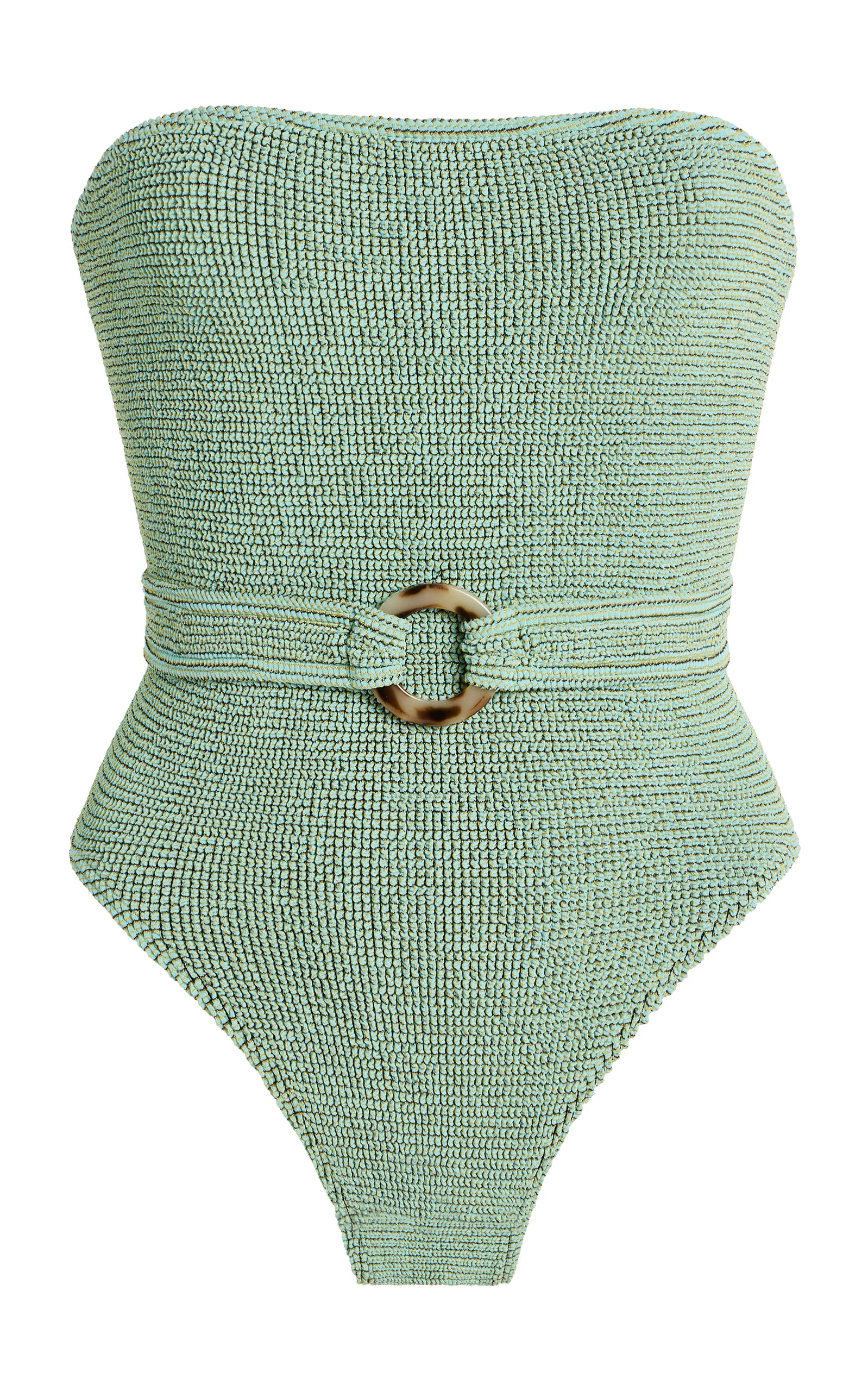 Bond-Eye is the embodiment of the iconic Australian summer spirit. Designed and handmade in Bondi, the label crafts considered and flattering swimwear from the signature one-size tubular crinkled fabric made famous in the 80s. This retro-inspired swimsuit has a clean strapless look with a flattering high-cut leg. It’s belted across the waist to further cinch the profile. PRODUCT DETAILS - Resort ‘26 - Slip on - Composition: 60% recycled nylon, 22% polyester, 7% nylon, 6% Lurex, 5% Lycra - Hand wash - Designer Color: Ice Blue - Made in Australia SIZE & FIT - One size only. This style comfortably fits those who are between a size XSmall-Large - Model is 5'10" with a 30" bust, 24" waist, and 34" hip