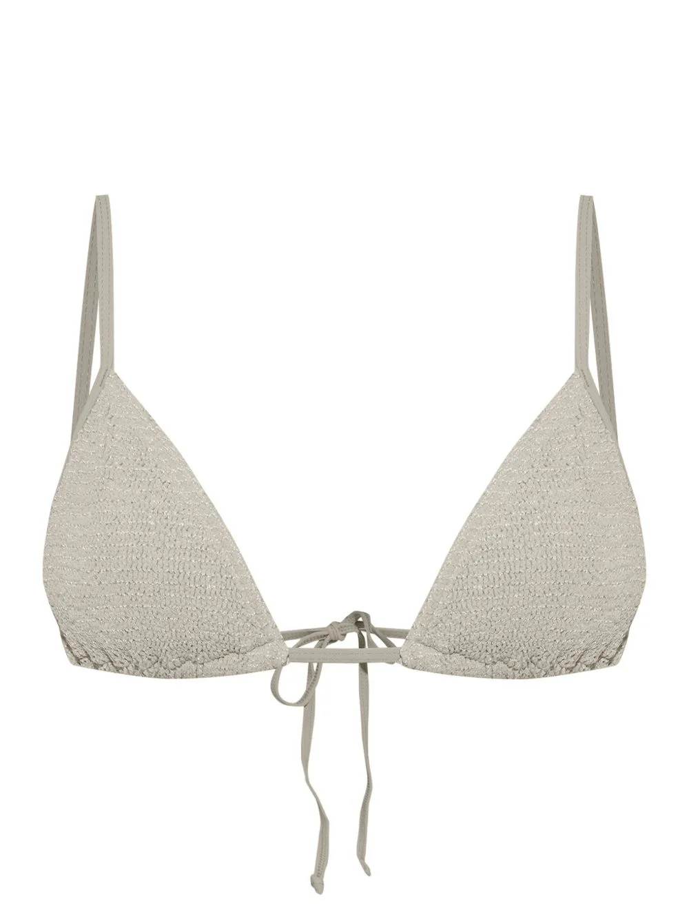 Luana triangle bikini top Highlights - Light grey - Stretch-design - Crinkled finish - Triangle cup - Adjustable spaghetti straps - Rear tie fastening Imported Composition Nylon 88%, Spandex/Elastane 12% Washing instructions Read Manufacturer Guidelines