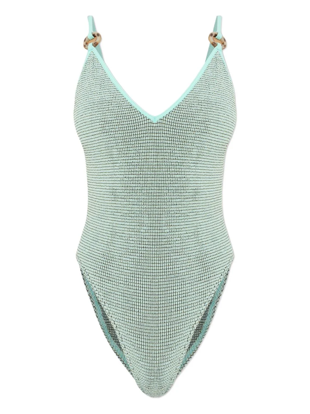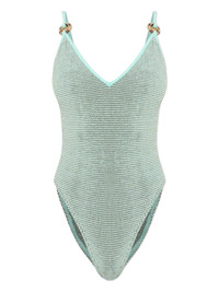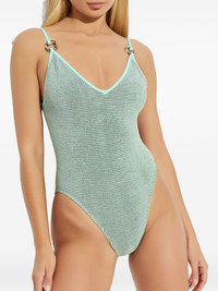 ring strap swimsuit Highlights - Ice blue - Ring detail - V-neck - Shoulder straps - Brief cut - Textured finish - Be mindful to try on swimwear over your own garments. Imported Composition Recycled Nylon 60%, Polyester 22%, Nylon 7%, Lurex 6%, Lycra 5% Washing instructions Hand Wash