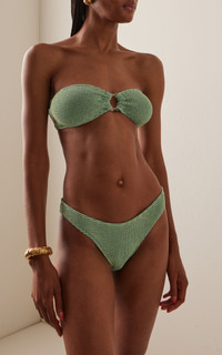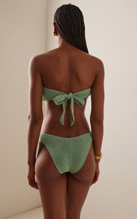 Bond-Eye is the embodiment of the iconic Australian summer spirit. Designed and handmade in Bondi, the label crafts considered and flattering swimwear from the signature one-size tubular crinkled fabric made famous in the 80s. ‘Sign’ is a low-rise silhouette with a high-cut leg and medium coverage. This version is colored a two-tone hue called ‘Ice Blue’ to match its corresponding bikini top. PRODUCT DETAILS - Resort ‘26 - Slip on - Composition: 60% recycled nylon, 22% polyester, 7% nylon, 6% Lurex, 5% Lycra - Hand wash - Designer Color: Ice Blue - Made in Australia SIZE & FIT - One size only. This style comfortably fits those who are between a size XSmall-Large - Model is 5'10" with a 30" bust, 24" waist, and 34" hip