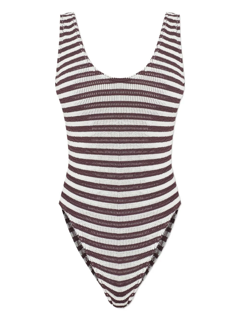 striped swimsuit Highlights - Brown and white - Striped - Scoop neck - Low back - High cut - Be mindful to try on swimwear over your own garments. Imported Composition Polyester 45%, Recycled Nylon 44%, Nylon 6%, Lycra 5% Washing instructions Hand Wash