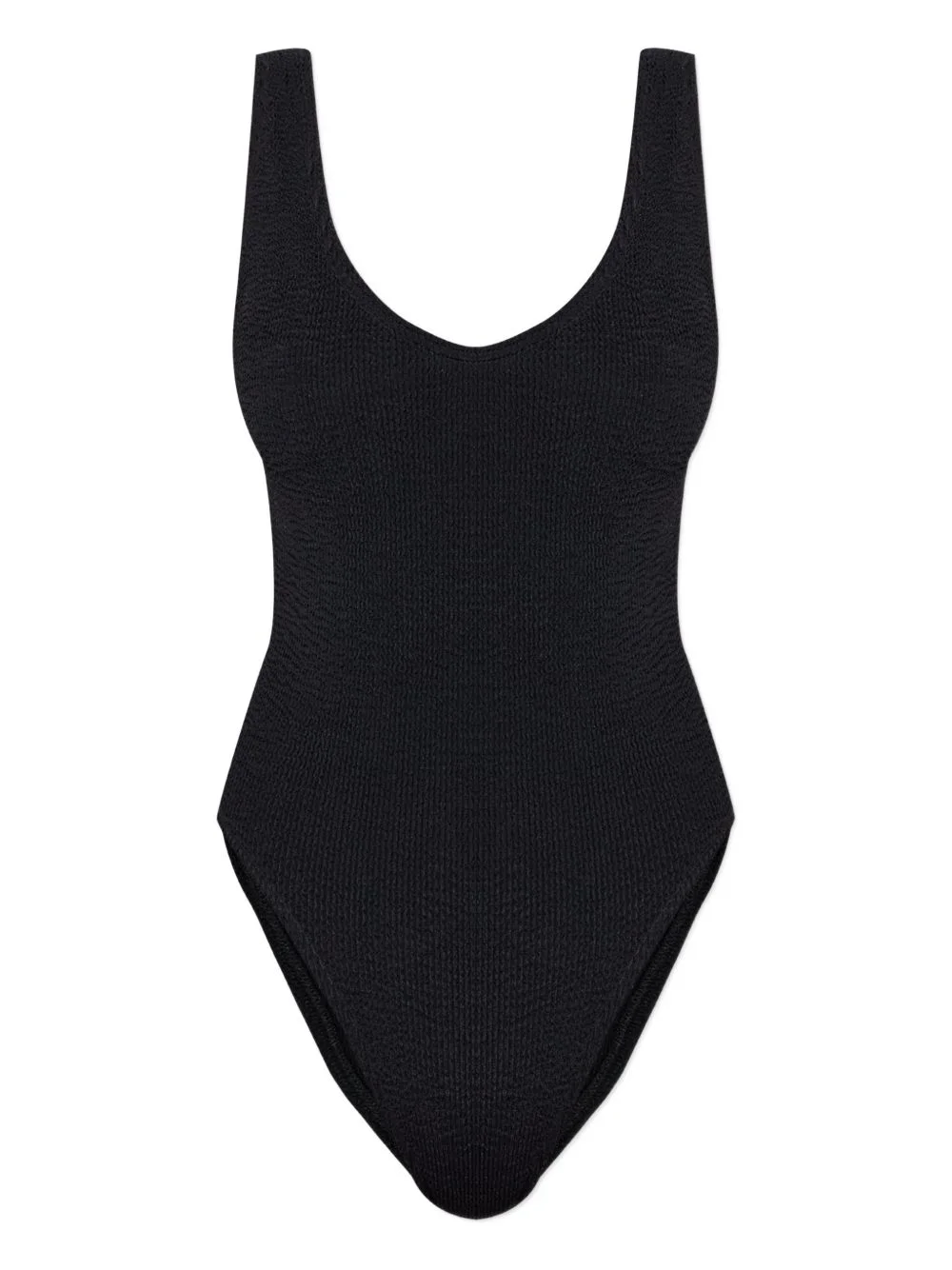 V-neck swimsuit Highlights - Black - Textured finish - V-neck - Wide shoulder straps - Scoop back - Be mindful to try on swimwear over your own garments. Imported Composition Recycled Nylon 88%, Nylon 7%, Lycra 5% Washing instructions Hand Wash