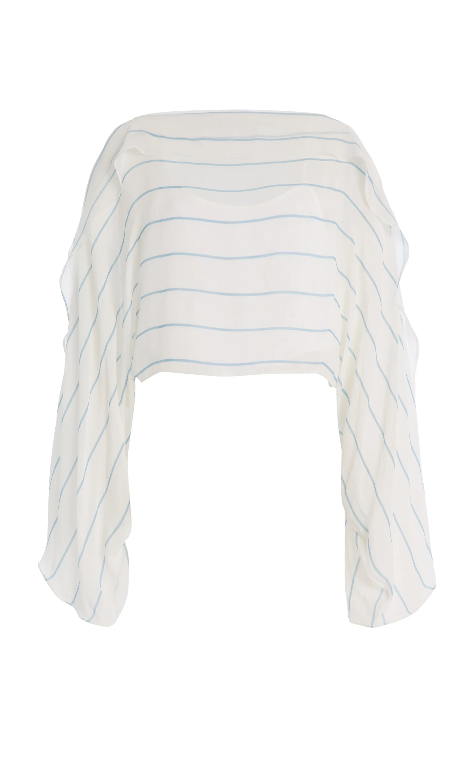 This season, Australian Natalia Grzybowski continues to flex her eye for ultra-flattering cuts that elevate fuss-free designs to chic, seductive heights—without compromising on sustainability. The 'Capri' top has a wide silhouette made from striped chiffon with a split neck that cascades down the kimono-style sleeves. Wear yours with the matching skirt. PRODUCT DETAILS - Resort '26 - Slip on - Composition: 100% viscose - Designer color: Smoke - Dry clean - Imported SIZE & FIT - Our model is wearing a size Small - Model is 5'10" with a 31" bust, 23.5" waist, and 33.5" hip