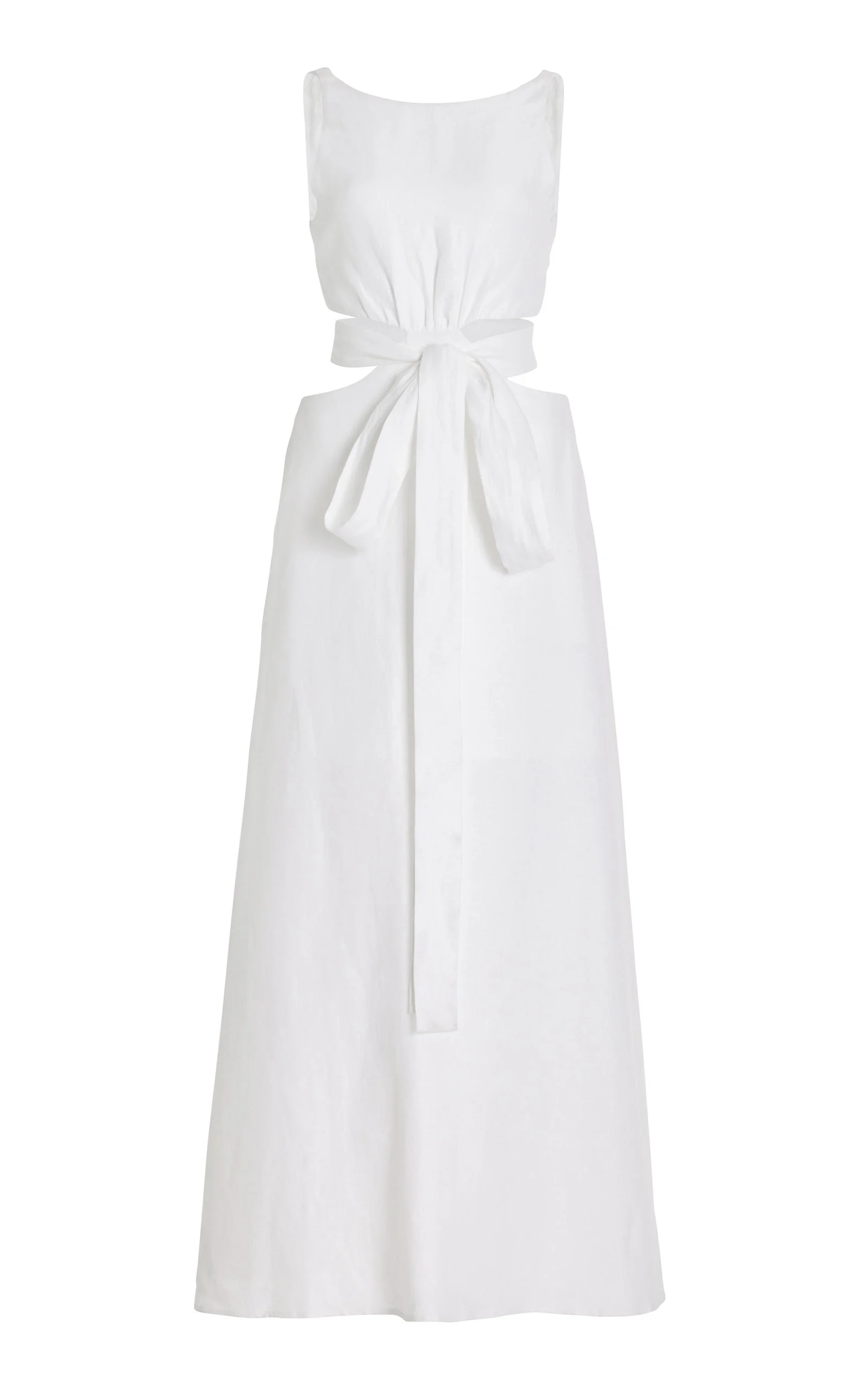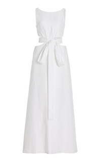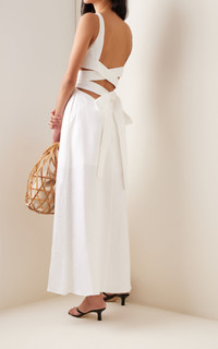 This season, Australian Natalia Grzybowski continues to flex her eye for ultra-flattering cuts that elevate fuss-free designs to chic, seductive heights—without compromising on sustainability. Tailored from sustainably sourced certified organic linen, the 'Comino' maxi has an A-line skirt that connects to the fitted apron top with strappy waist ties. Wear it casually with leather slides and a woven beach tote. PRODUCT DETAILS - Tie fastening at waist; concealed zip fastening along back - Composition: 100% Portuguese organic linen, GOTS Certified, Standard 100 OKEO-TEX® Certified, EU Reach Certified - Dry clean - Made in Portugal SIZE & FIT - Our model is 180cm/ 5'11" and wearing a size Small - This item fits true to size - We suggest taking your normal size