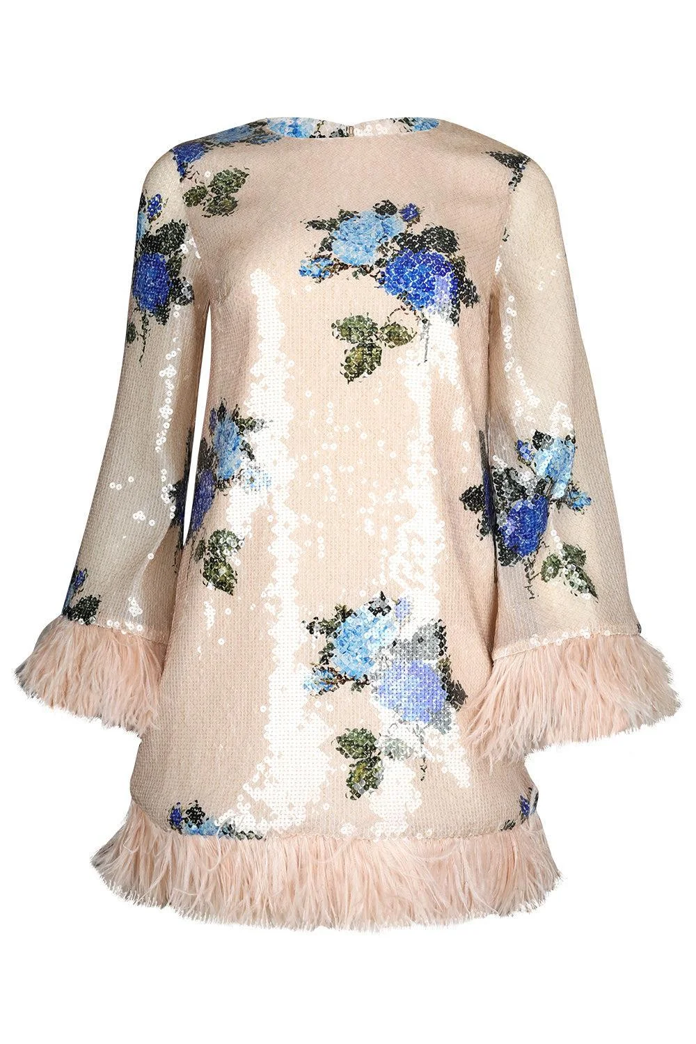 DETAILS AND INSIGHT Borgo De Nor stevie sequin dress in rose blue. 92% Polyester 8% Elastane / Lining: 100% Recycled Polyester / Trim: 100% Ostrich Feather Dry Clean Only Made In Portugal Style STEVIE-ROSE BLUE