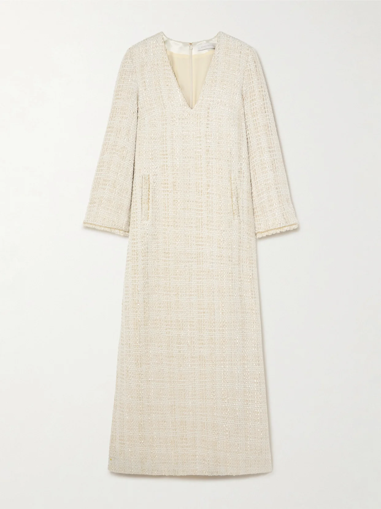 Borgo de Nor's collections are designed to celebrate femininity. This ‘Eponine' maxi dress is made from shimmering tweed and cut for a loose fit with relaxed dropped shoulders and a generous V-neckline.