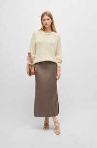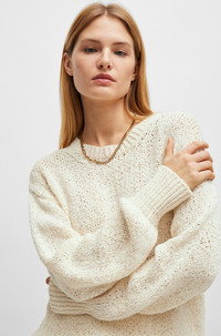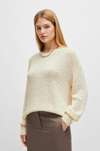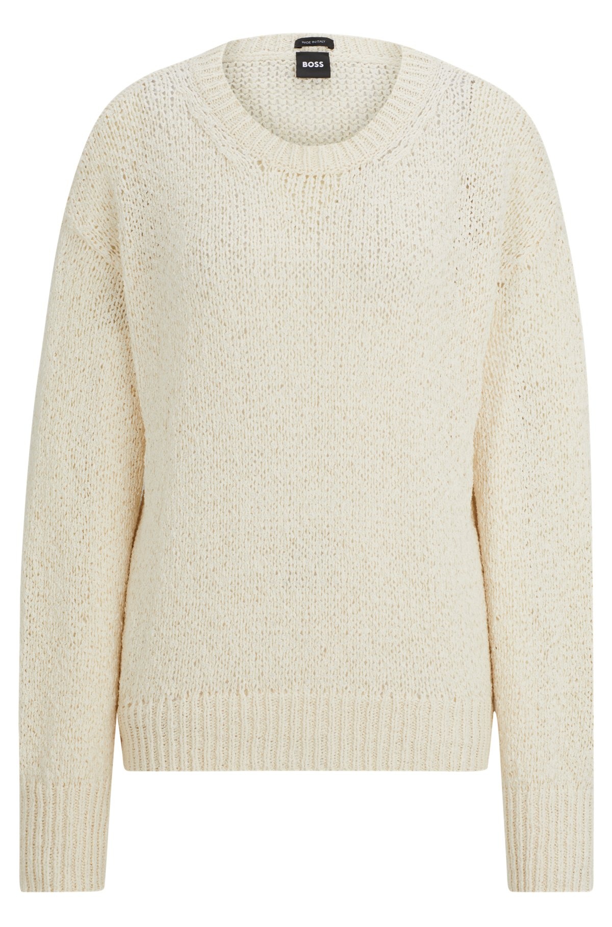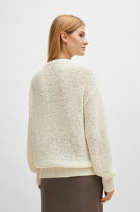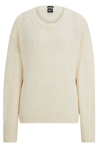 SIZE AND FIT The model wears a size S and is 5'10" tall with a, 34" chest, 24" waist and 35" hips. DETAILS Felodiena - 50514603 A summery crew-neck sweater by BOSS Womenswear, knitted in tape yarn with an open structure. Neckline: Crew neck Long sleeves QUALITY & CARE INSTRUCTIONS Do Not Bleach Do Not Tumble Dry Hand Wash Only Dry Clean Only Iron Low Heat Quality: 74% Cotton, 26% Polyamid