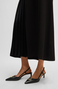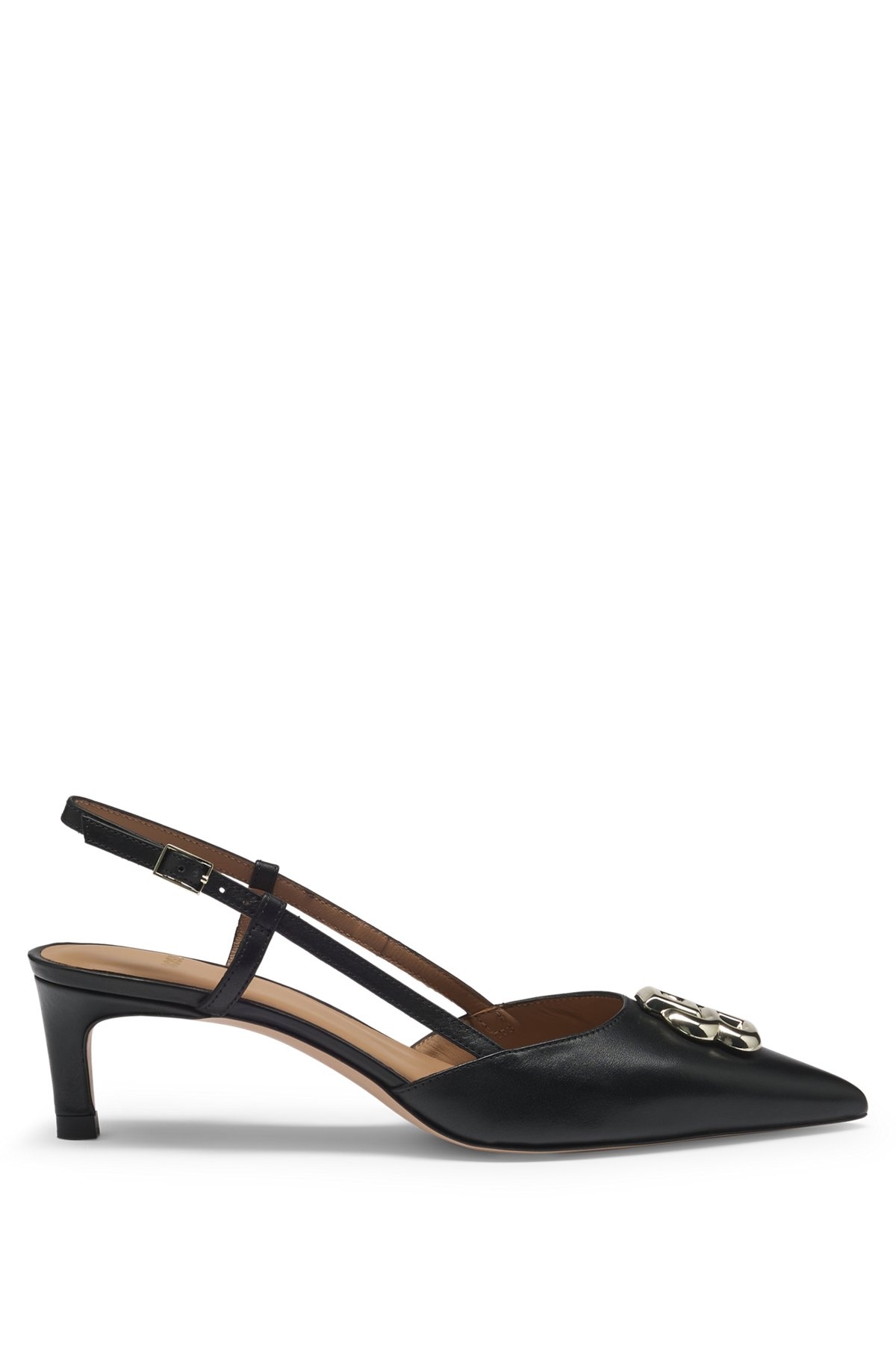 DETAILS Janet_SLB50_NABB - 50523386 Pointed-toe pumps, with a 5cm heel, by BOSS. Featuring a metallic Double B monogram trim, this signature pair is crafted in smooth nappa leather. Fastening top: Slip-on Packaging: Box QUALITY & CARE INSTRUCTIONS Upper material: 100% Sheepskin, Lining: 100% Sheepskin, Sole: 100% Synthetic rubber, Innersole: 100% Sheepskin