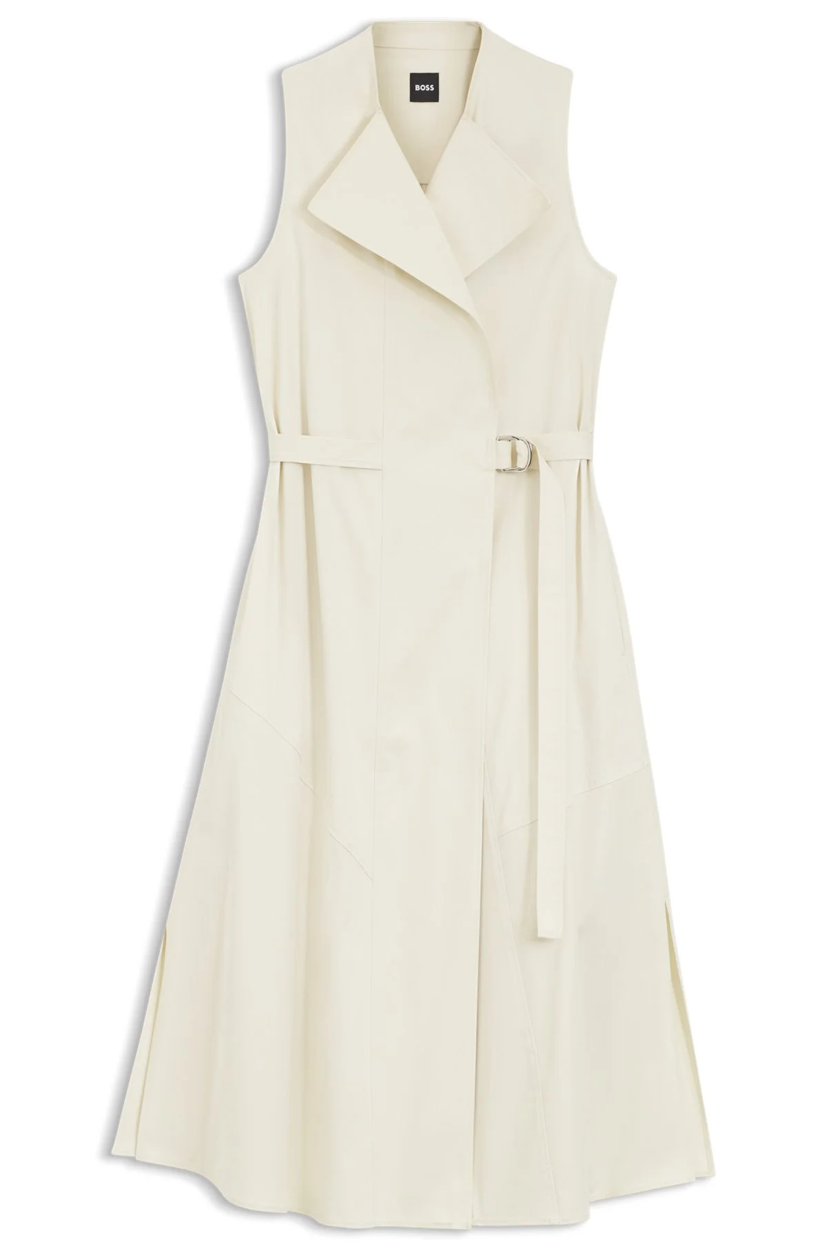 SIZE AND FIT The model wears a size 4 and is 5'10" tall with a, 33" chest, 24" waist and 35" hips. DETAILS A modern take on a classic, this BOSS Womenswear wrap dress is cut in soft stretch cotton. Large lapels. Adjustable belt for a flattering profile. Regular fit Fastening top: Belted closure Sleeveless Pockets top: Seam pocket Side slit Fit back length: 120 cm (47 inches) Dimosa2 - 50557446 QUALITY & CARE INSTRUCTIONS Material: 97% Cotton, 3% Elastane Machine Wash Cold Gentle Do Not Bleach Do Not Tumble Dry Iron Low Heat Reduced Dry Clean