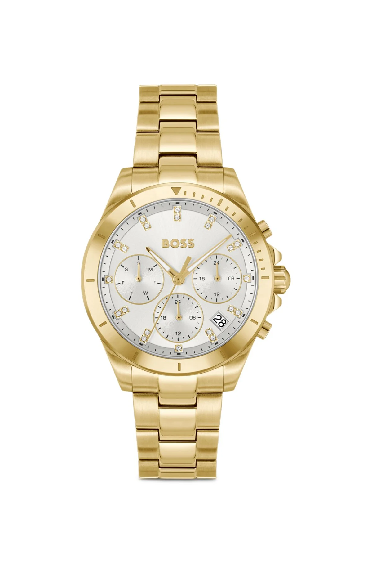DETAILS Combining rich golden steel with sparkling crystal indices, this BOSS Womenswear watch strikes an elegant note. Sporty bezel design. Silver-white dial with three subeyes. Watch mechanism: multi-eye Dial color: Silver-white Strap material: Stainless steel Closure: Push-button deployment Case size: 1.42 in (36 mm) (0 inches) Water Resistance (in ATM): 5 ATM ALLEY - 58565071 QUALITY & CARE INSTRUCTIONS Material: 100% Stainless steel