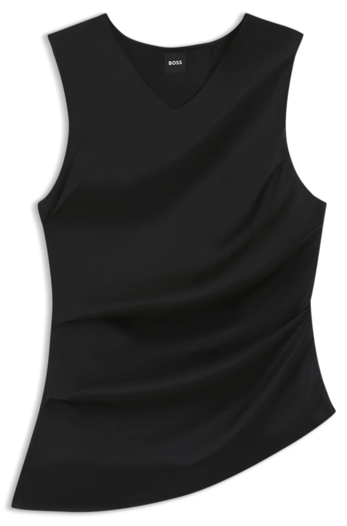 SIZE AND FIT The model wears a size S and is 5'10" tall with a, 33" chest, 23" waist and 34" hips. DETAILS With a stretch-silk front and asymmetric hem, this BOSS Womenswear top creates a twisted look for modern appeal. V neckline. Rear logo tube. Slim fit Neckline: V-neck Sleeveless Etorsa - 50548125 QUALITY & CARE INSTRUCTIONS Hand Wash Only Quality: 100% Viscose, Front panel: 94% Silk, 6% Elastane Do Not Tumble Dry Iron Low Heat Reduced Dry Clean Do Not Bleach