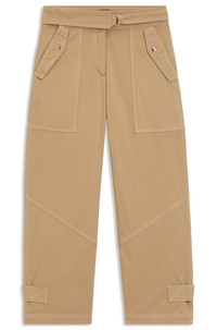 SIZE AND FIT The model wears a size 4 and is 5'10" tall with a, 31" chest, 24" waist and 35" hips. DETAILS C_Tulia-D - 50541421 Cut to a contemporary shape with adjustable hems, these belted BOSS Womenswear trousers are an essential investment. Paper-touch stretch-cotton twill. Utility-inspired details. Relaxed fit Regular rise Hook and zip closure Belted closure Cuffed leg Pockets bottom front: Side pockets Pockets bottom back: Welt pocket QUALITY & CARE INSTRUCTIONS Iron Low Heat Machine Wash Cold Gentle Reduced Dry Clean Do Not Tumble Dry Quality: 97% Cotton, 3% Elastane, pocketing: 55% Cotton, 45% Polyester Do Not Bleach