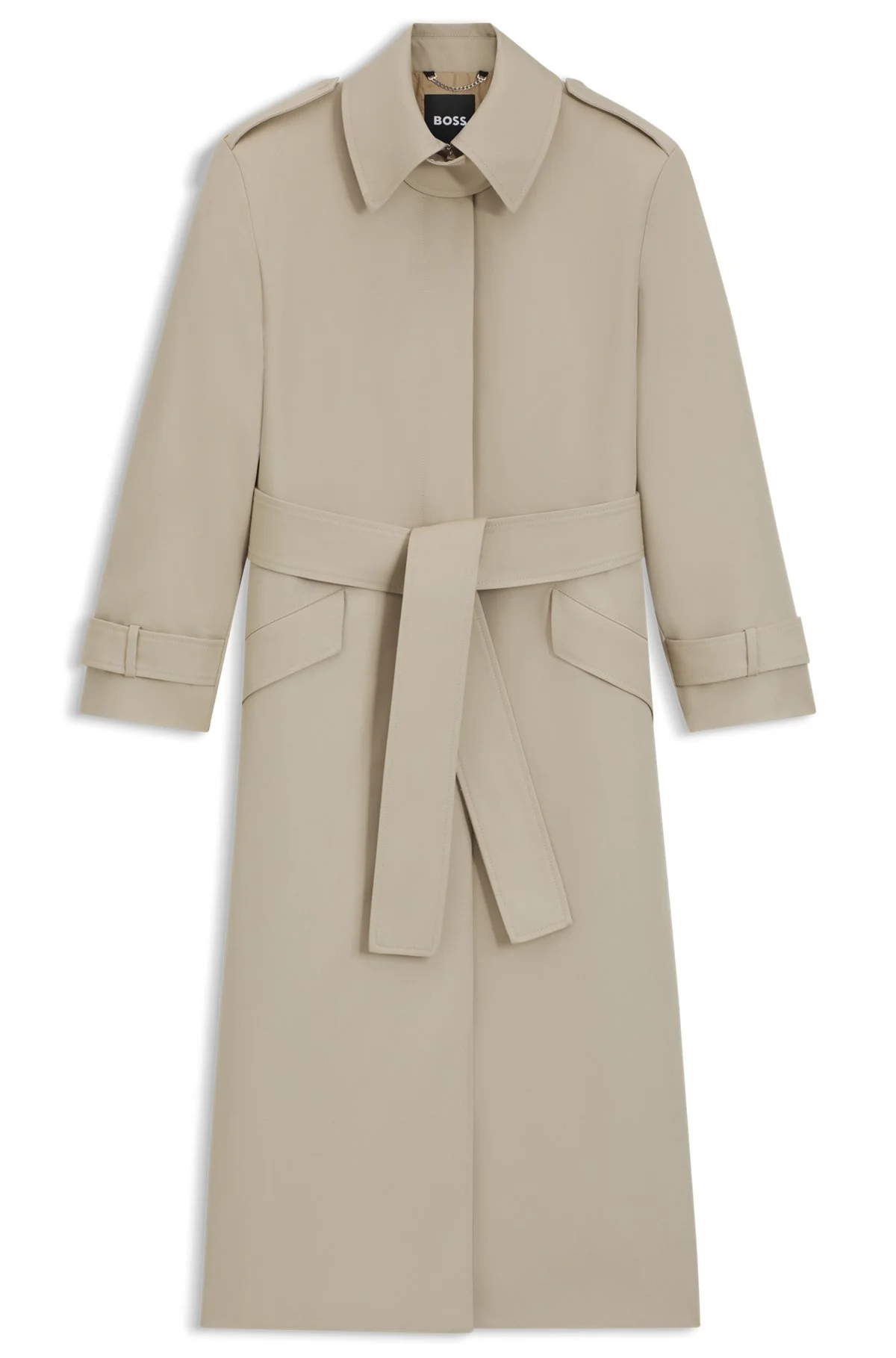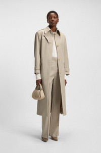 SIZE AND FIT The model wears a size 4 and is 5'10" tall with a, 31" chest, 24" waist and 35" hips. DETAILS Ciolet - 50543198 Defined at the waist with a tonal belt, this BOSS Womenswear trench coat cuts a clean profile. Designed in wool twill with authentic detailing. Regular fit Point collar Fastening top: Concealed closure Pockets top: Flap pockets Belted cuffs Back vent Fully lined Long length Fit back length: 124 cm (49 inches) QUALITY & CARE INSTRUCTIONS Reduced Dry Clean Do Not Bleach Do Not Tumble Dry Do Not Wash Iron Low Heat Quality: 100% Virgin wool, Lining: 55% Polyester, 45% Viscose