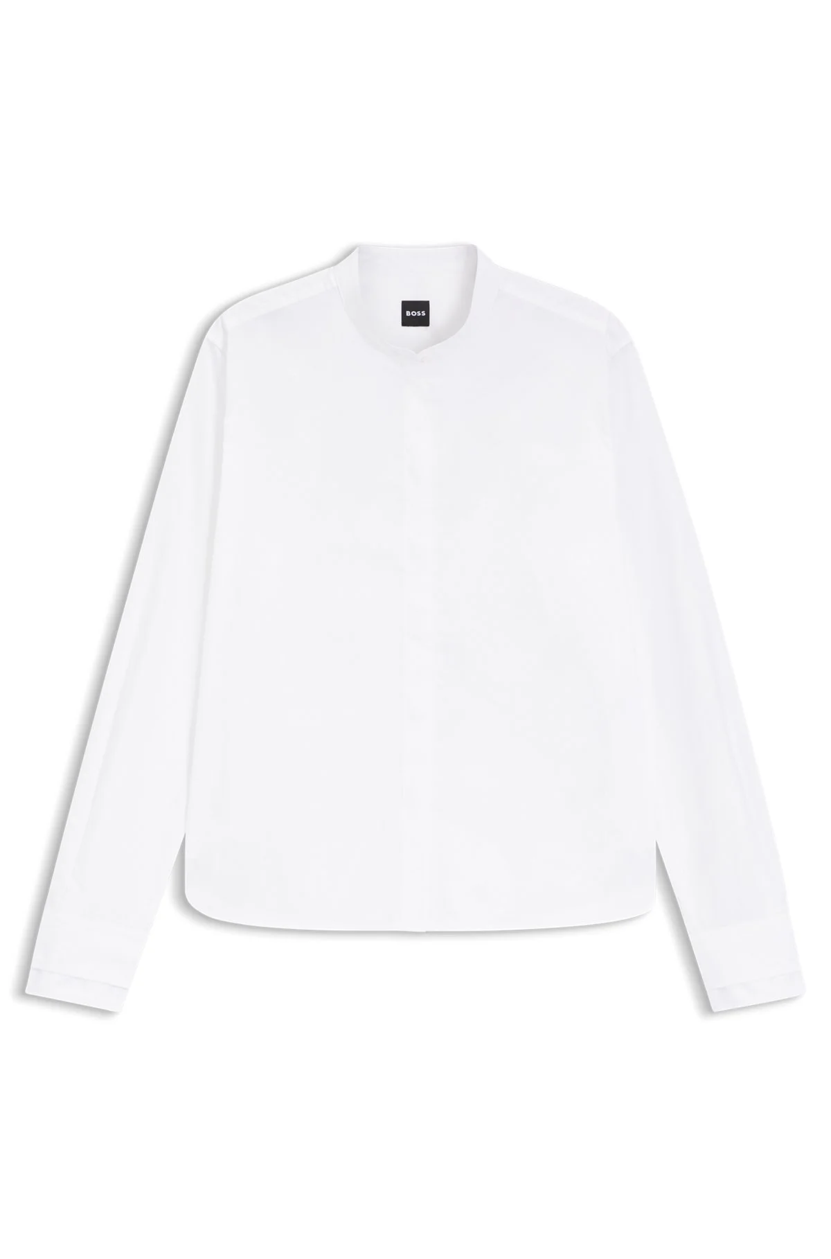 SIZE AND FIT The model wears a size 2 and is 5'9" tall with a, 32" chest, 23" waist and 35" hips. DETAILS Bertyna_Monday - 50543684 With a stand collar, barrel cuffs and regular fit, this BOSS Womenswear blouse is so easy to style. Cotton poplin with an extra-soft feel. Regular fit Stand collar Long sleeves Barrel cuffs Fit back length: 60 cm (24 inches) QUALITY & CARE INSTRUCTIONS Do Not Tumble Dry Quality: 100% Cotton Iron Low Heat Do Not Bleach Machine Wash Cold Do Not Dry Clean