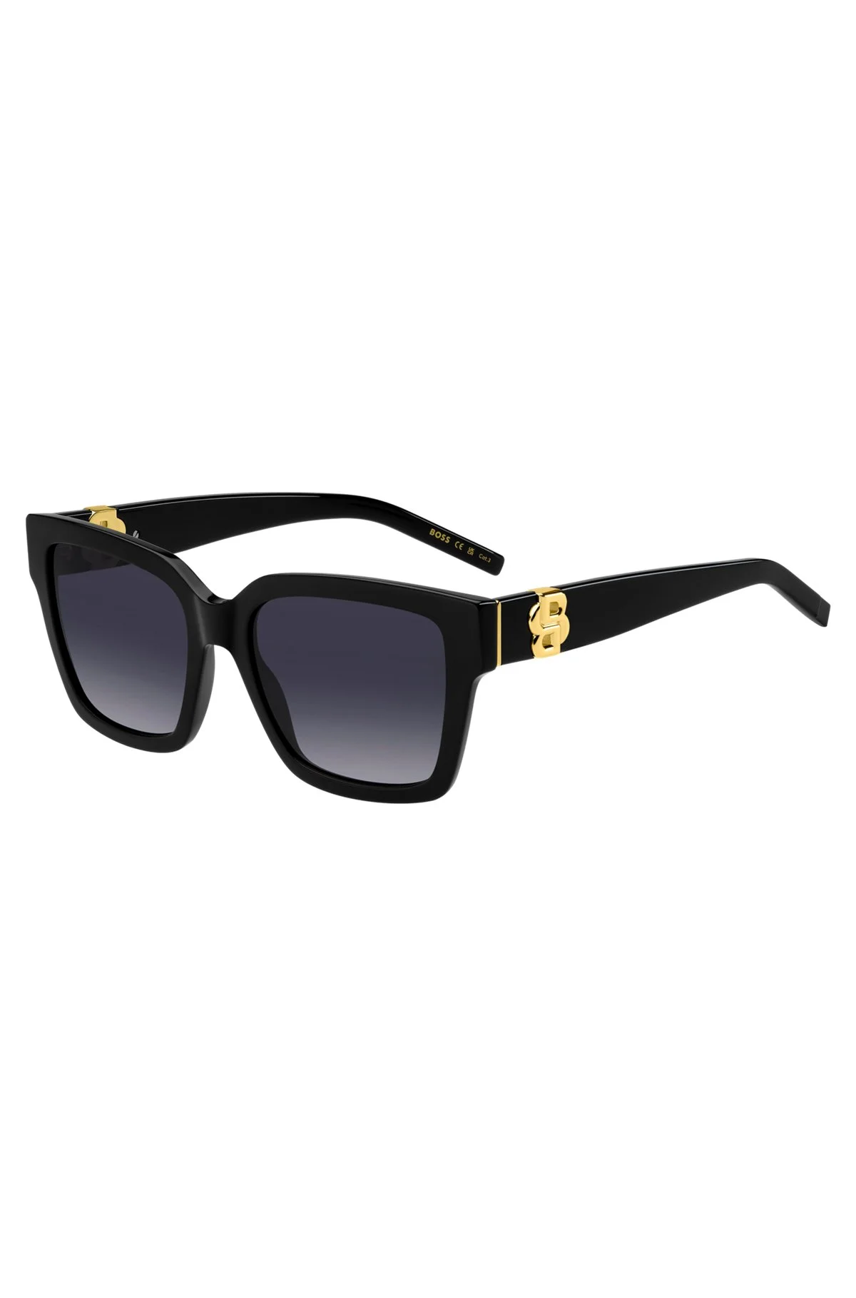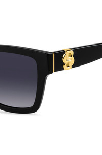 DETAILS BOSS 1744/S807549O - 58138253 Statement sunglasses by BOSS Womenswear. Featuring gold-tone Double B monograms on the temples, this pair is crafted in black acetate. Front material: Acetate Temple material: Metal Hinge type: Regular Lens: Shaded Lens material: Polyester Size lens: 2.13 in (54 mm) (0 inches) Size bridge: 0.71 in (18 mm) (0 inch.) Temple Length: 5.7 in (145 mm) (0 inches)
