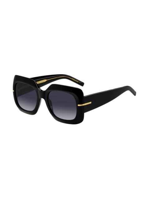DETAILS BOSS 1730/S807549O - 58138171 Engineered with a visible wire core, these BOSS Womenswear sunglasses make a modern statement. Crafted in chunky black acetate elevated by luxurious gold-tone hinges. Front material: Acetate Temple material: Acetate Hinge type: Regular Lens: Shaded Lens material: Polyester Size lens: 2.13 in (54 mm) (0 inches) Size bridge: 0.83 in (21 mm) (0 inch.) Temple Length: 5.7 in (145 mm) (0 inches)
