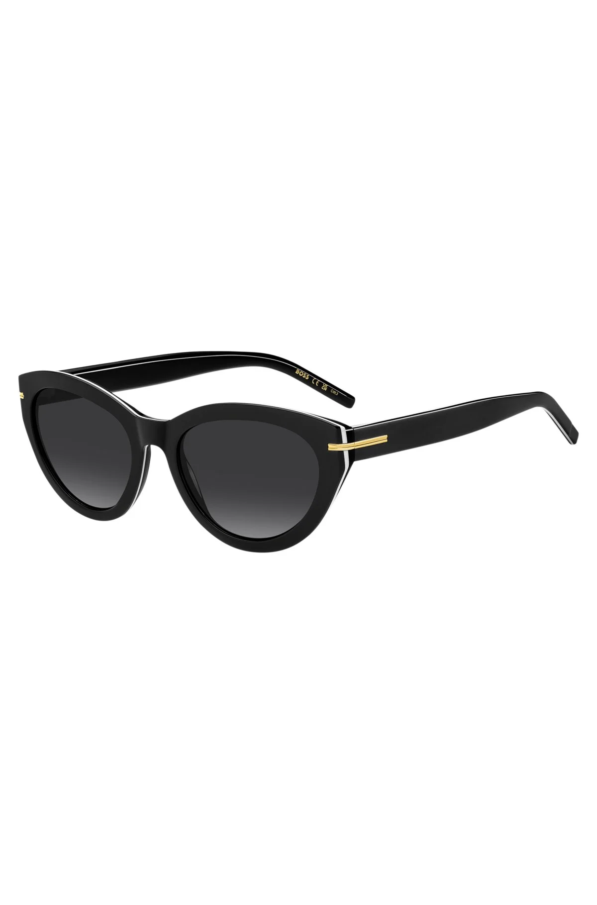 DETAILS BOSS 1779/SP56559O - 58332891 Create a bold profile with these BOSS Womenswear cat-eye sunglasses. Crafted in black acetate punctuated by luxe gold-tone detailing. Front material: Acetate Temple material: Acetate Hinge type: Regular Lens: Full color Lens material: Polyester Size lens: 2.17 in (55 mm) (0 inches) Size bridge: 0.75 in (19 mm) (0 inch.) Temple Length: 5.7 in (145 mm) (0 inches)