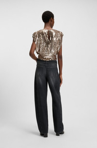 SIZE AND FIT The model wears a size 27/32 and is 5'11" tall with a, 31" chest, 23" waist and 34" hips. DETAILS In black-washed rigid denim, these BOSS Womenswear jeans embrace the modern balloon cut in style. Long, detachable D-ring belt with stitched details. Relaxed fit High rise Button and zip closure Belted closure Pockets bottom front: Side pockets Wide leg Pockets bottom back: Patch pocket Open length C_BALOON HR BELT - 50548453 QUALITY & CARE INSTRUCTIONS Material: 100% Cotton, pocketing: 70% Polyester, 30% Cotton Do Not Bleach Do Not Dry Clean Machine Wash Cold Gentle Do Not Tumble Dry Iron Medium Heat