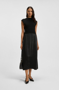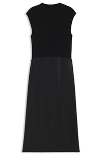 SIZE AND FIT The model wears a size S and is 5'10" tall with a, 33" chest, 23" waist and 34" hips. DETAILS Ferdolini - 50542873 Combining smooth satin with a soft knit for a pulled-together look, this BOSS Womenswear dress will become a favorite. Elegant side-seam stripe. Regular fit Neckline: Mock Neck Fastening top: Zip closure Cap sleeves No vent Unlined Fit back length: 128 cm (50 inches) QUALITY & CARE INSTRUCTIONS Do Not Tumble Dry Quality: 100% Polyester, upper part: 76% Viscose, 24% Polyamid Hand Wash Only Iron Low Heat Do Not Bleach Dry Clean Only