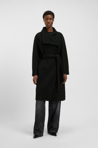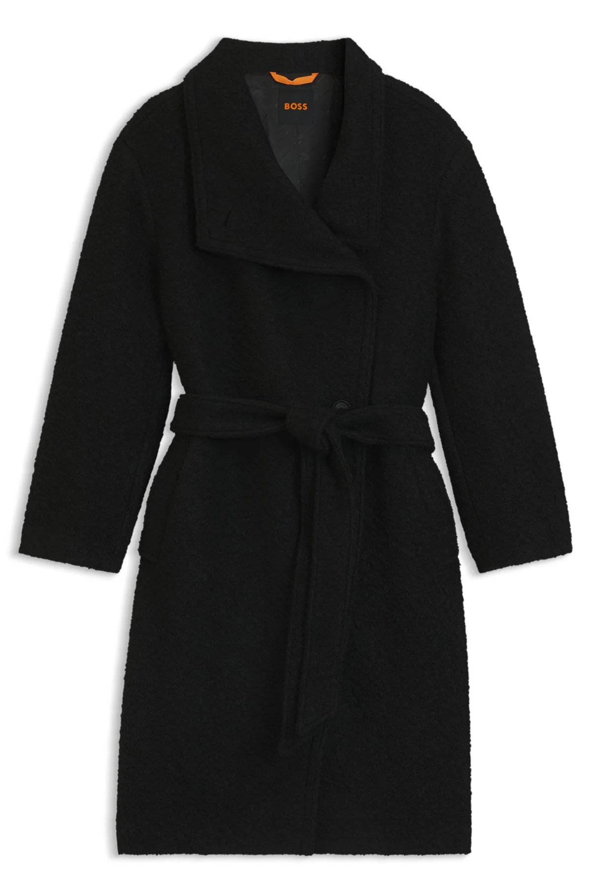 SIZE AND FIT The model wears a size 4 and is 5'11" tall with a, 31" chest, 23" waist and 34" hips. DETAILS C_Cayla - 50549084 Featuring a stand collar that can be worn open or closed, this modern BOSS Womenswear coat is crafted in textured boucle with wool. Fabric belt. Regular fit Stand collar Fastening top: Belted closure Number of buttons: 3 Pockets top: Welt pockets Back vent Standard length Fit back length: 105 cm (41 inches) QUALITY & CARE INSTRUCTIONS Do Not Tumble Dry Reduced Dry Clean Quality: 60% Polyester, 40% Wool, Lining: 55% Polyester, 45% Viscose, Sleeve lining: 55% Polyester, 45% Viscose Iron Low Heat Do Not Wash Do Not Bleach