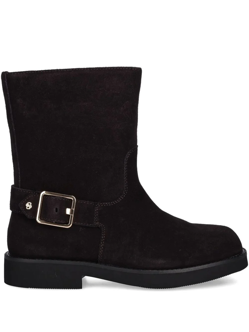 buckle-strap boots Highlights - Dark brown - Buckle strap - Round toe - Flat sole - Pull-on style Imported Composition Outer: Suede 100% Lining: Fabric 100% Sole: Rubber 100%