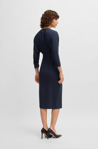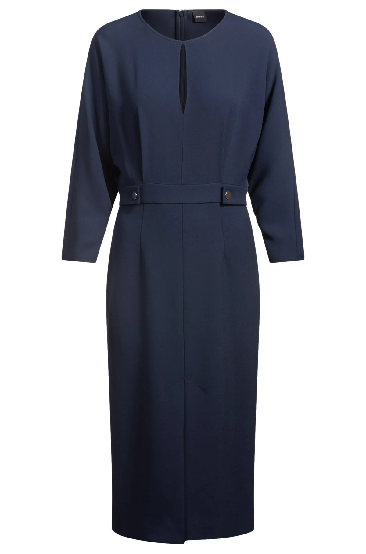 SIZE AND FIT The model wears a size 2 and is 5'9" tall with a, 31" chest, 24" waist and 35" hips. DETAILS Ditela - 50531895 A keyhole-neckline dress with buttoned tabs on the waist by BOSS Womenswear. Relaxed fit Neckline: Scoop neck Fastening top: Zip and hook closure 7/8 sleeves Back vent Fully lined Fit back length: 115 cm (45 inches) QUALITY & CARE INSTRUCTIONS Reduced Dry Clean Do Not Bleach Do Not Tumble Dry Do Not Wash Quality: 67% Viscose, 29% Polyester, 4% Elastane, lining yoke: 55% Polyester, 45% Viscose, Top: 72% Acetate, 28% Viscose Iron Low Heat